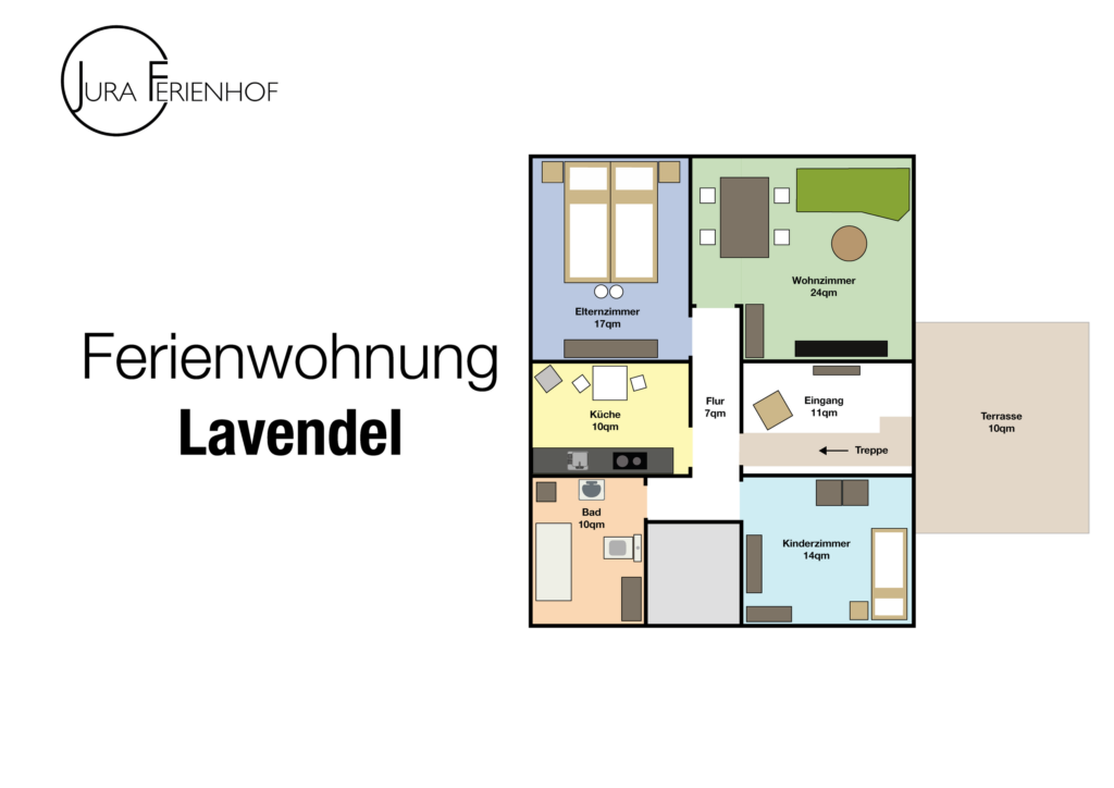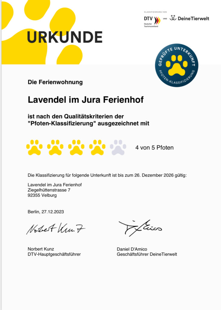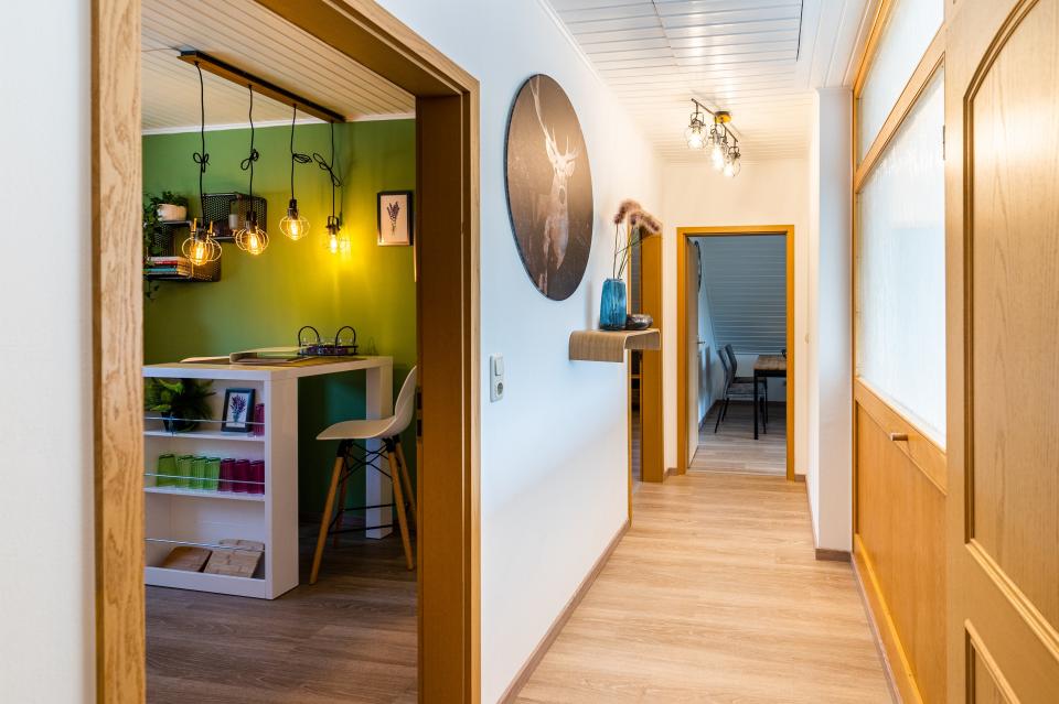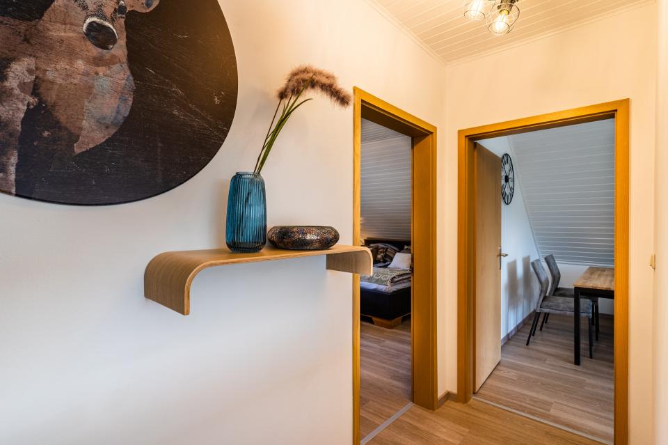 Die im ersten Obergeschoss befindliche 5-Sterne-Ferienwohnung Lavendel besticht durch ihre liebevolle Einrichtung. Die voll ausgestattete Einbauküche mit zwei Herdplatten und Essplatz bietet alles für kulinarische Genüsse. Im gemütlichen Wohnzimmer mit Sofa und TV können Sie entspannen. Das Schlafzimmer ist mit einem komfortablen Doppelbett (180 x 200 cm) und einem großzügigen Kleiderschrank ausgestattet; Bettwäsche ist inklusive. Ein weiteres Zimmer mit Bett und Kleiderschrank steht zur Verfügung. Das großzügige Bad verfügt über eine Dusche, Badewanne, Waschbecken und eine Toilette; Handtücher sind für alle Gäste inklusive. Eine zentral im Erdgeschoss gelegene Waschmaschine steht Ihnen kostenfrei zur Verfügung.